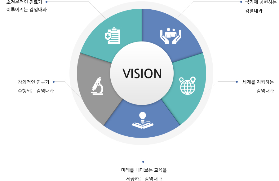 혁신적 사고와 진취적인 열정으로 최고 수준의 진료·연구·교육을 성취하며, 국가적·국제적 활동을 선도함으로써, 감염으로부터 안전한 세상을 만드는데 기여한다.