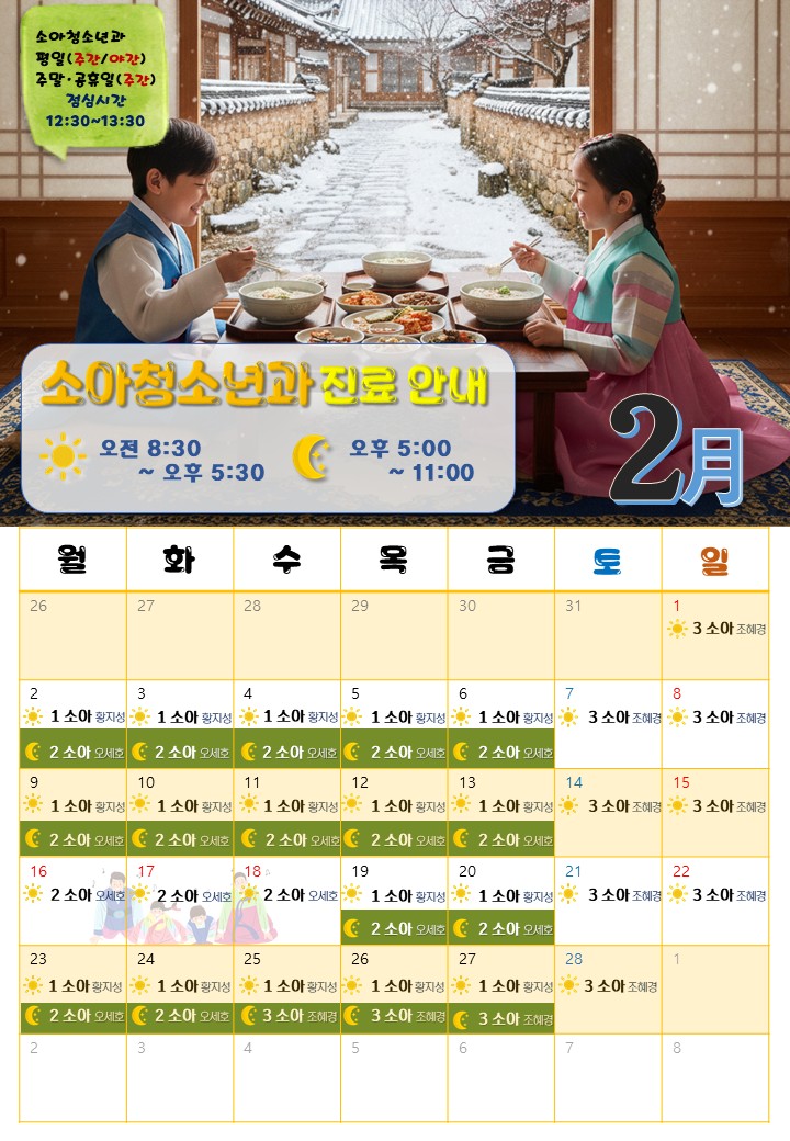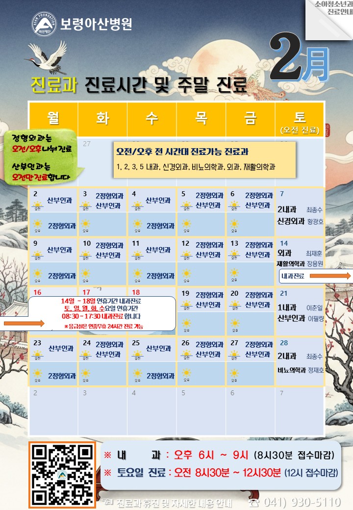 | 제목 : 26년 2월 진료 일정 안내 (진료시간, 토요일 진료, 휴진) | ||||||||||||||