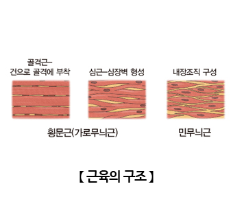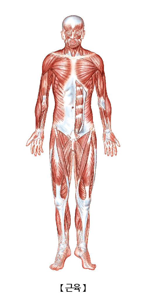 우리 몸의 골격을 이루는 뼈에 부착하여 운동을 가능하게 해주는 기관입니다. 우리 몸의 근육은 크게 골격근, 심장근, 내장근으로 구분할 수 있으며 기능에 따라 자신의 의사로 수축을 조절할 수 있는 수의근과 수축을 조절할 수 없는 불수의근, 모양에 따라 가로무늬근과 민무늬근으로 나눌 수 있습니다.