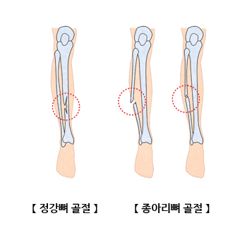 정강뼈는 교통사고, 운동 중 손상, 추락사고, 스키사고 등으로 골절이 발생할 수 있으며, 정강뼈와 종아리뼈가 함께 골절될 수도 있고, 둘 중 하나만 골절될 수 있습니다. 심한 경우 골절된 부위의 다리 모양이 변형될 수 있습니다.