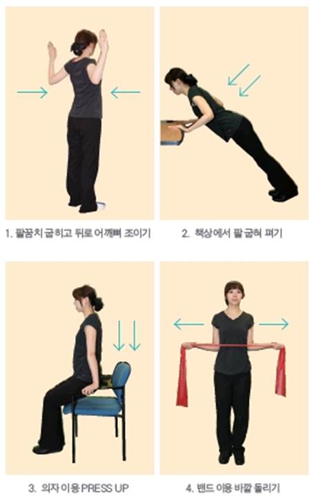 허리를 곧게 펴고 양팔을 옆으로 90도 벌려 팔꿈치를 직각으로 만듭니다. 이 자세를 유지하면서 등에 있는 어깨뼈를 서로 만나게 하듯 조였다 풀기를 반복합니다.