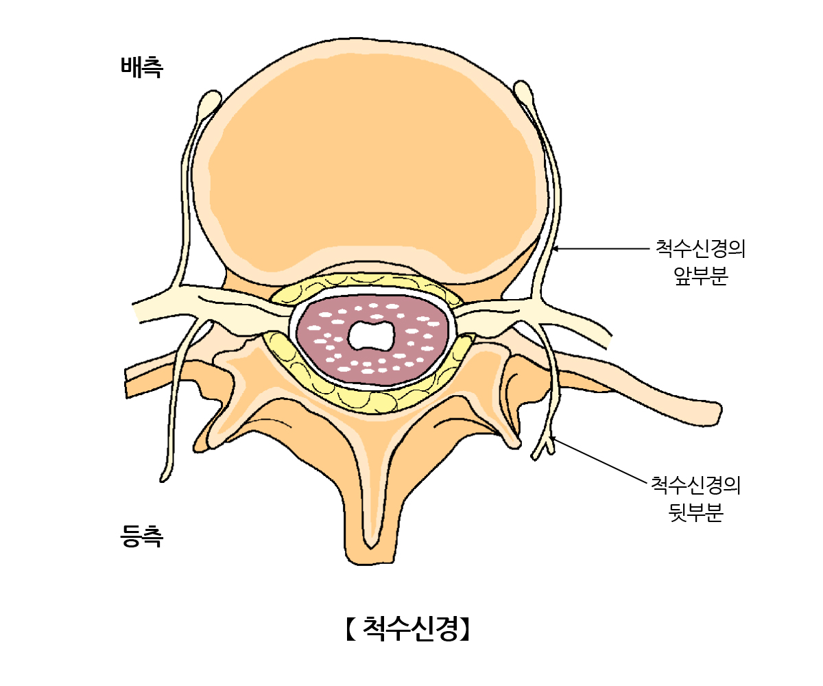 척수신경은 총 31쌍으로 8쌍의 목신경, 12쌍의 가슴신경, 5쌍의 허리신경, 5쌍의 엉치신경, 1쌍의 꼬리신경으로 이루어져, 척추뼈의 양 옆을 통과합니다. 척수신경의 손상이 의심될 경우 위치에 따라 지배하는 부위가 다르므로 증상에 의해 손상 부위를 예측할 수 있습니다.