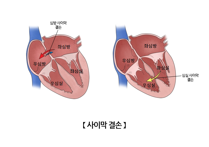 만약 심장의 중격 부위에 결손이 생기면 심방이나 심실의 혈액이 교류하므로 순차적인 혈액의 순환이 어려워집니다. 또한 심방이나 심실의 결손이 발생한 경우 정맥혈과 동맥혈이 뒤섞여 산소가 충분하지 못한 혈액이 전신으로 운반되므로 전신의 장기 및 조직이 기능하는데 어려움이 있을 수 있습니다. 중격에 결손이 생길 경우 결손의 크기에 따라 증상이 달라질 수 있으며, 자연적으로 닫히는 경우도 있으나 수술을 통해 치료가 필요할 수 있습니다.- 헬스팁