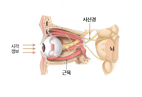 안구는 안구 외의 주변 구조물들과 함께 작용하여 시각정보를 수집하고 뇌로 전달하는 기능을 합니다. 세 겹의 막으로 안구의 둥근 모양이 유지되고, 안구 주변 근육과 함께 적절한 방향으로 안구가 움직입니다. 각막이 외부의 빛을 받아들이고 홍채와 모양체의 작용으로 안구 내로 들어오는 빛을 조절합니다. 각막과 모양체, 수정체의 작용으로 외부의 상을 망막으로 정확하게 초점을 맞추고, 망막으로 전달된 시각 정보를 시신경을 통해 뇌로 전달합니다.