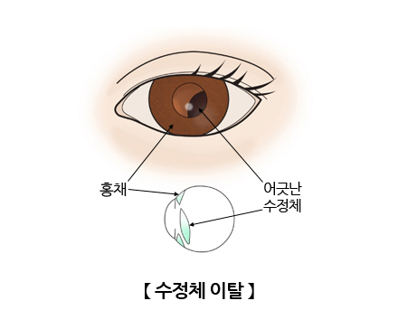 수정체를 지지하는 인대가 손상되거나 약화되면 제자리에서 벗어날 수 있습니다. 이를 수정체 탈구라 하며, 선천적으로 인대가 약하거나 야구공에 눈을 맞은 것처럼 외부 충격에 의해 수정체가 탈구될 수 있습니다. 마르판증후군 환자의 절반 이상은 수정체 탈구를 경험한다고 알려져 있습니다.