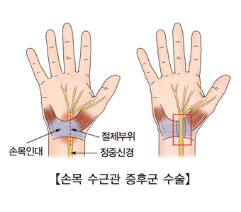 손목의 손바닥쪽에 수근관이 있고 이 관 속에 손가락을 구부리는 힘줄과 정중신경이 지나가는데, 이때 신경이 눌리거나 압박을 받으면 손목과 손, 손가락이 저리고 마비가 오는 듯한 통증을 느끼게 됩니다. 이를 수근관증후군이라고 합니다.