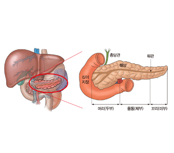 췌장은 약 15cm, 무게는 약 100g 정도로 가늘고 긴 모양이며 머리, 몸통, 꼬리의 3부분으로 나눌 수 있습니다.