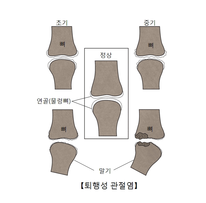 슬관절은 오랫동안 사용하여 관절연골이 닳아 발생하는 퇴행성 관절염이 많이 발생합니다. 주로 남녀 모두 50세 이후에 빈번하며, 과거 관절에 외상이 있었거나 비만, 관절에 무리한 스트레스 등이 관절을 약하게 하는 원인들입니다. 관절염은 움직일 때 관절에 통증이 발생하나 질환이 진행되면 휴식을 취해도 통증이 지속되고, 움직이려고 하면 관절이 뻣뻣한 느낌이 들며, 무릎이 붓거나 육안으로 확인되는 관절의 변형 등의 증상이 있습니다. 영상검사 및 관절경 검사로 확진이 가능하며, 약과 운동요법, 물리요법으로 치료를 하나 보존적인 방법으로도 호전이 없을 시에는 수술적 요법으로 치료하게 됩니다.