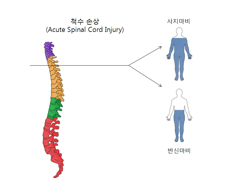 척수의 손상은 뇌로 들어오는 감각이나 뇌에서 나가는 운동능력을 잃게 하는데 척수가 손상된 지점에 따라 신체 마비 혹은 감각 상실의 종류와 정도가 정해집니다. 일반적으로 손상된 지점이 윗부분일수록 기능의 손실이 큽니다. 손상을 받은 척수의 아랫부분의 신체는 정상적으로 기능할 수 없고, 윗부분의 기능은 지장을 받지 않습니다. 그리고 척수의 손상은 자율신경계 또한 방해하며 뇌는 이를 통제할 수 없어 혈압, 체온조절, 소화기, 성기, 방광의 작용에 변화가 올 수 있습니다.