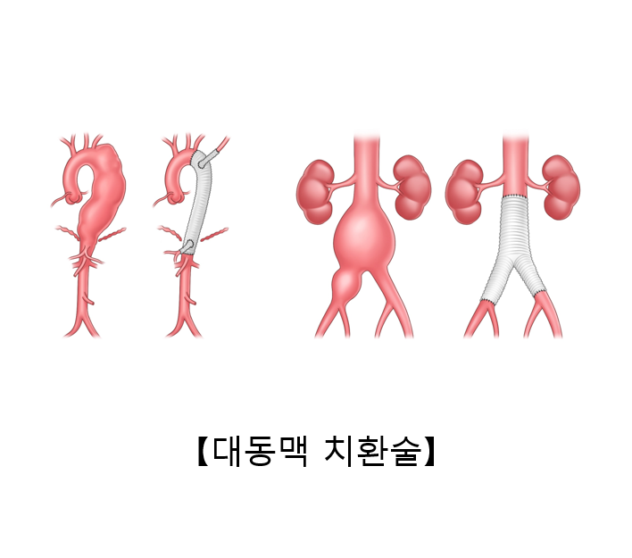 모든 대동맥류의 수술 원칙은 대동맥류를 절제하고 인조 혈관으로 대체하는 것입니다. 하지만 수술 방법은 대동맥류의 위치와 모양, 주위 혈관과 장기와의 관계, 환자의 상태에 따라 아주 다양하므로 전문의의 판단에 따르는 것이 좋습니다.대동맥류의 위치와 모양이 적합하다고 판단될 때 제한적으로 경피적(percutaneous)으로 스텐트(인조 철망)를 삽입하여 치료할 수 있습니다. 이는 피부에 구멍을 내어 시술에 필요한 도구를 병변까지 삽입하여 치료하는 방법입니다. 이 치료는 수술과 비교하여 입원 기간과 회복 기간이 짧고, 발생하는 합병증도 적다는 장점이 있지만, 아직 해결되지 않은 부분이 많아 제한적으로 시행되고 있습니다.