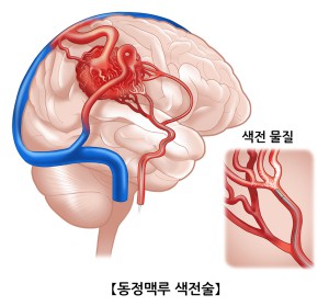 정상적인 뇌 혈류는 큰 동맥→작은 동맥→모세 혈관→작은 정맥→큰 정맥 순으로 흐릅니다. 큰 동맥의 높은 압력은 모세 혈관 및 작은 정맥을 거치면서 낮아집니다. 뇌 동정맥 기형은 선천적인 뇌 발생 과정에서 동맥과 정맥 사이에 발생했어야 할 모세 혈관이 생기지 않고, 뇌동맥에서 뇌정맥이 바로 연결되는 혈관 덩어리를 형성하는 질환입니다.