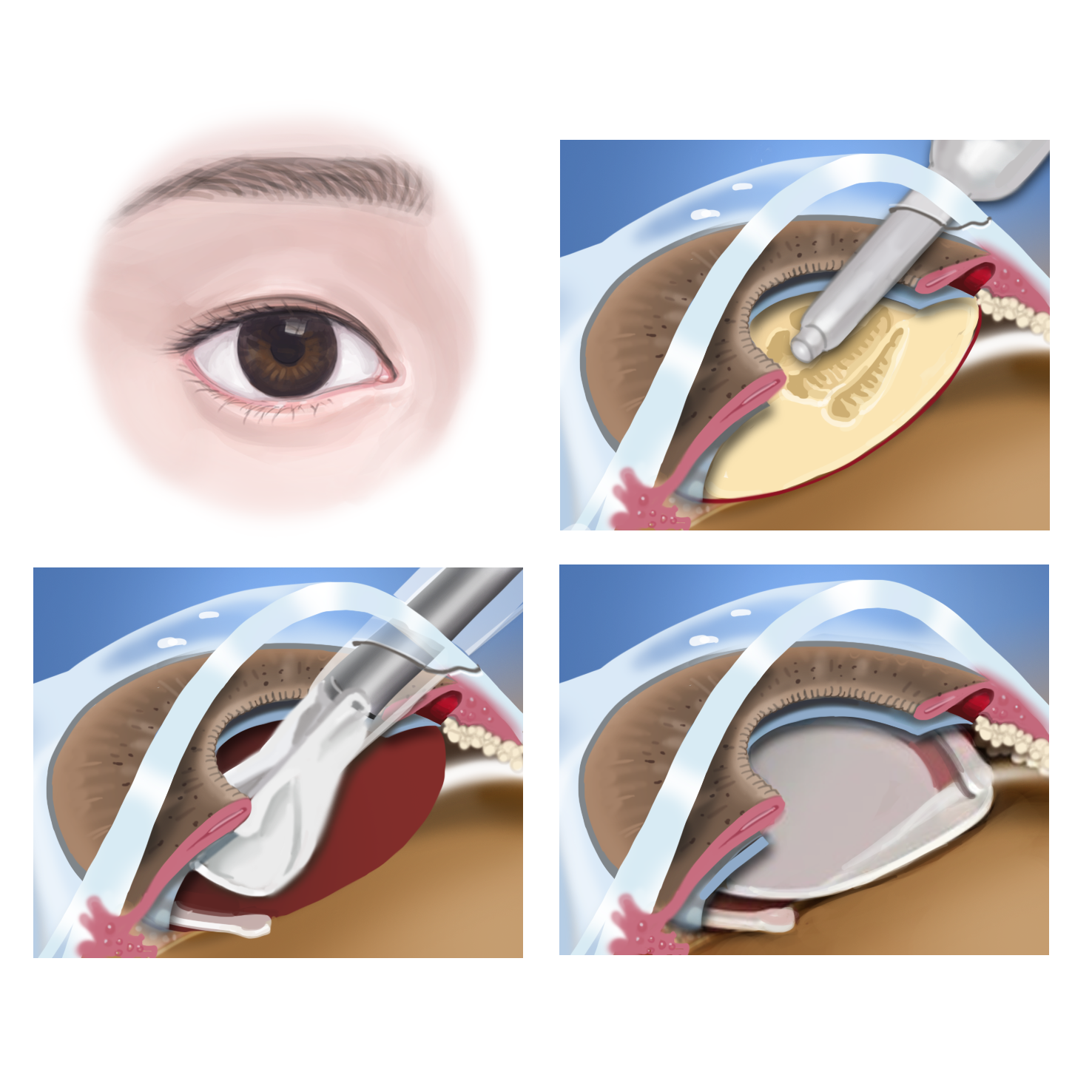 백내장 수술은 눈의 검은자나 흰자에 작은 구멍을 만든 후, 이곳에 초음파 기구를 삽입하여 백내장이 생긴 수정체를 흡인하고 그 자리에 수정체와 유사하게 생긴 영구적인 인공 수정체를 삽입하는 방식으로 시행됩니다. 안경알의 두께가 다양하여 여러 도수가 있는 것처럼, 수술을 받는 사람의 필요에 맞추어 가까운 곳 또는 먼 곳이 잘 보이도록 인공 수정체의 도수를 선택하여 눈 안에 삽입합니다.② 수술 후 치료