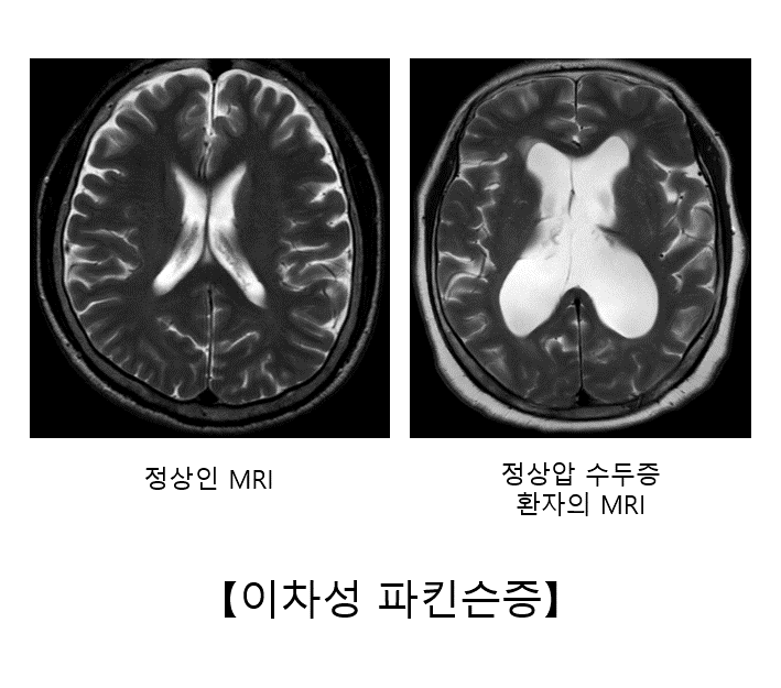 정상압 수두증은 뇌척수액이 원활하게 순환되지 않아 뇌실이 확장되면서 주변 뇌를 압박하여 정상적인 기능에 장애를 초래하는 질환을 말합니다. 정상압 수두증의 가장 주된 증상은 보행 장애입니다. 환자는 발을 넓게 벌리고 종종걸음을 걷습니다. 파킨슨병처럼 운동 완만이나 체위 불안정도 흔하게 나타납니다. 배뇨 장애와 인지 기능의 저하가 동반되는 경우가 많습니다.정상압 수두증은 뇌 전산화 단층촬영(CT)이나 뇌 자기공명영상(MRI)에서 뇌실이 커져 있는 소견이 확인됩니다. 척수 천자를 통해 뇌척수액을 배액했을 때 일시적으로 파킨슨 증상이 호전되면 진단할 수 있습니다. 이러한 경우 뇌실복강션트라는 수술을 하면 지속적으로 뇌척수액을 배액하여 증상을 호전시킬 수 있습니다.
