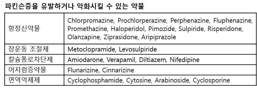파킨슨증은 다양한 약물에 의해 발생할 수 있습니다. 특히 도파민 수용체를 차단하거나 고갈시키는 약물은 파킨슨병과 같은 떨림, 운동 완만, 보행 장애 등의 증상을 유발합니다. 도파민 수용체를 차단하는 약물에는 대표적으로 항정신병약이 있습니다. 또한 레보설피라이드와 같이 최근 많이 처방되는 위장관 운동 장애에 대한 치료제도 파킨슨증을 유발할 수 있는 것으로 알려져 있습니다. 약물에 의한 파킨슨증이 발생한다면 원인 약물을 중단하면 증상이 호전될 수 있습니다. 경우에 따라서는 일시적으로 항파킨슨약을 사용하기도 합니다.