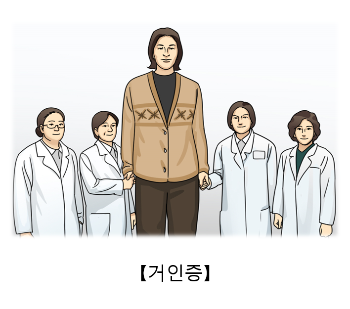 뇌하수체에서 과도하게 성장호르몬이 분비될 때 생기는 증상입니다. 성장판이 닫히지 않은 사춘기 이전에 생깁니다.