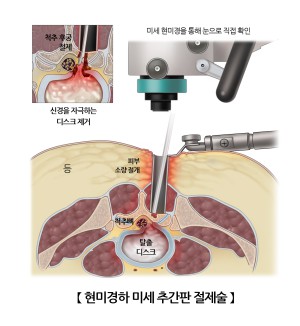 신경마비가 심하거나 통증이 심할 경우, 발가락이나 발목의 힘이 현저하게 약해져 있는 경우, 대소변을 보는 힘이 약해진 경우, 다리를 전혀 움직일 수 없는 심각한 마비 증상을 보이는 경우 등 일상생활에 장애가 생기면 신경을 누르고 있는 수핵을 제거하는 수술을 합니다.수술은 일반적으로 전신 마취 후 현미경 시야에서 최소 절개(약 2~3cm)하여 뼈(후궁판)에 조그만 구멍을 만들고, 이를 통하여 탈출한 추간판을 절제하는 방법으로 진행됩니다.