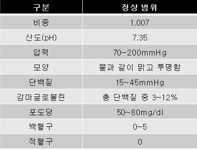 뇌척수액 검사는 요추천자를 통해 배액한 뇌척수액을 분석하여 뇌내의 감염성 질환, 출혈, 종양 등 중추신경계의 다양한 질환을 진단하는데 이용되는 검사방법입니다. 뇌척수액 검사를 통해 뇌압을 측정할 수 있고, 뇌척수액의 형태를 알 수 있으며 뇌척수액 내 포도당, 단백질, 백혈구, 적혈구, 감마글로불린의 양을 측정할 수 있고, 뇌척수액의 미생물 배양검사, 세포형태학적 검사 등을 시행할 수 있습니다.