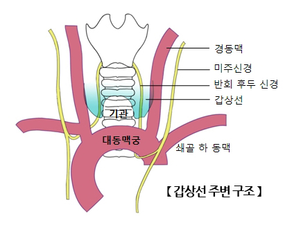 갑상선의 양 옆으로 성대 신경이 지나가는데, 수술 중 많은 조작으로 인해 신경이 부어 일시적으로 목소리가 변할 수 있고 성대 마비 및 흡인이 발생할 수 있습니다.