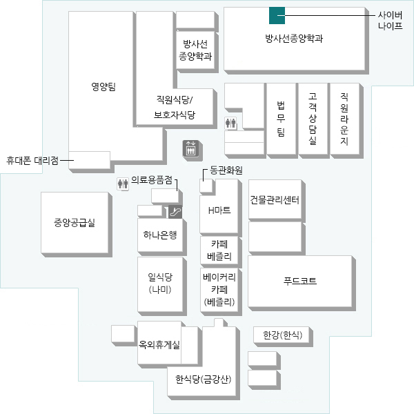 동관 1층 정문 에스컬레이터 지하1층 직진(구두수선실 방향) 방사선종양학과