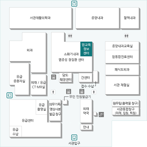 서관 1층 정문 직진 후 외래약국 방향으로 우회전 채혈실 방향으로 좌회전 암교육정보센터