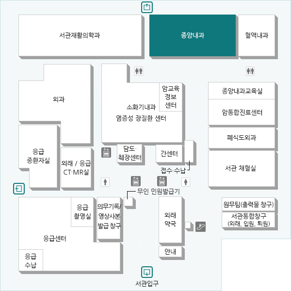 서관 1층 정문 직진 후 외래약국 방향으로 우회 서관 채혈실 방향으로 좌회전 종양내과