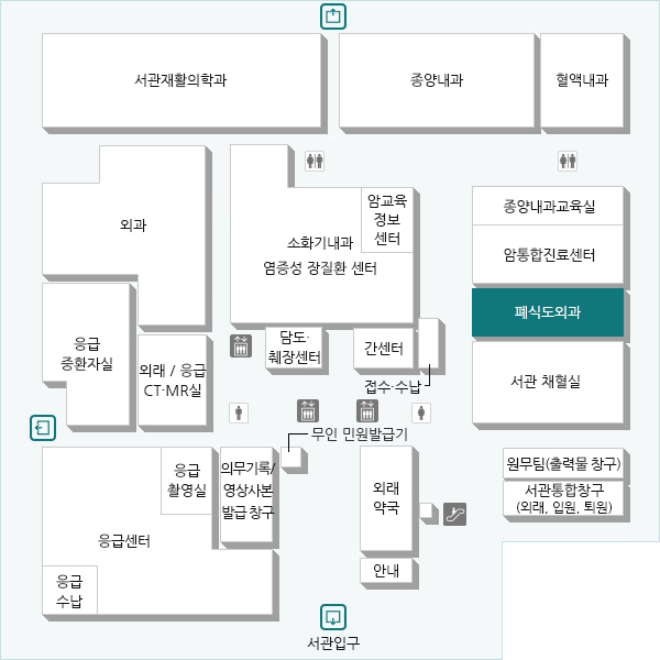 서관 1층 정문 직진 후 외래약국 방향으로 우회전 서관채혈실 옆 폐식도외과