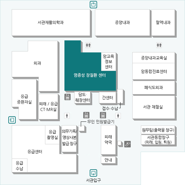 서관 1층 정문 좌측 방향 직진 염증성장질환센터