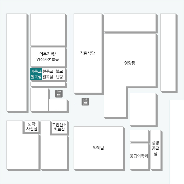 엘리베이터 또는 계단 직원식당 입구 맞은편 기독교 원목실