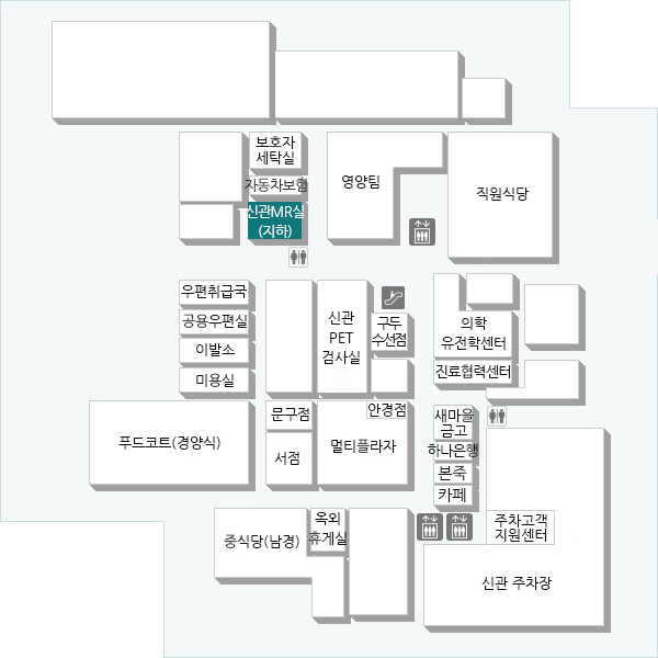 신관 1층 정문 에스컬레이터 지하 1층 동관 방향 직진 신관 MR실(지하)