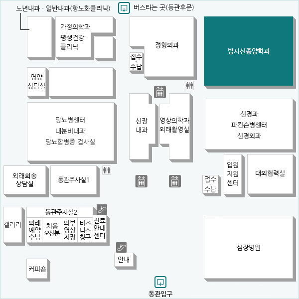 동관 1층 정문 직진 우측 방향 방사선종양학과