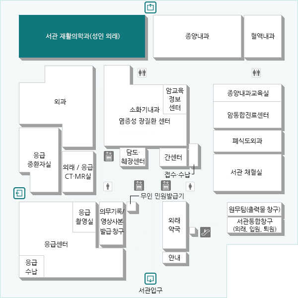 서관 1층 정문 직진 후 좌측 방향 응급촬영실 방향으로 우회전 직진