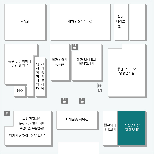 동관 에스컬레이터 2층 신관 방향 직진 운동부하검사실(심장검사실)