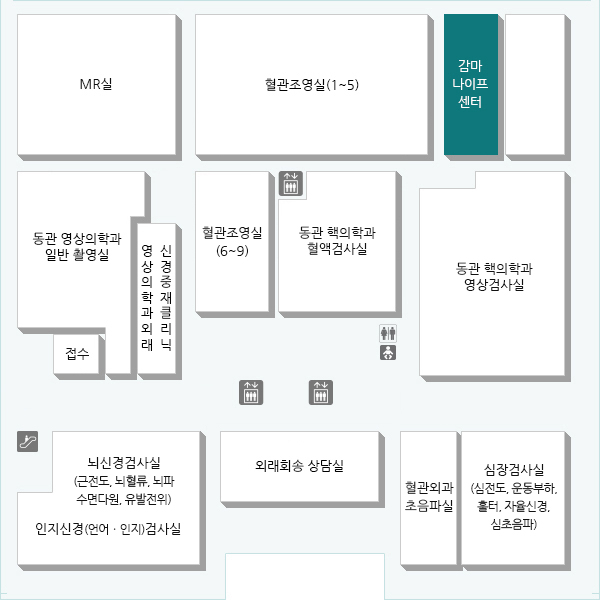 에스컬레이터 2층 신관 방향 직진 좌회전 후 우측 방향 감마나이프센터