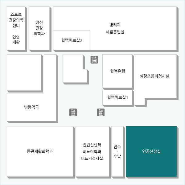 동관 1층 정문 엘리베이터 4층 신관 방향 인공신장실