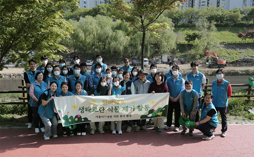 서울아산병원 직원봉사단은 ESG 활동의 일환으로 병원 인근 성내천 뚝방길이 병원 인근 지역주민의 쉼터로서 보다 아름다운 꽃길을 만들고자 생태교란식물 제거 봉사활동을 실시하였다.