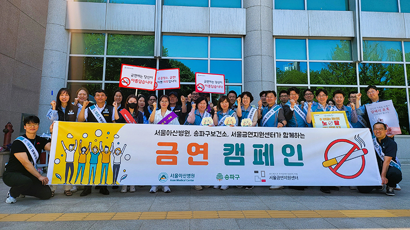 보안관리팀 주관으로 5월 31일 ' 세계 금연의 날'을 맞아 송파구 보건소 및 서울금연지원센터와 협업으로 금연 캠페인 행사를 실시하였다. 보안관리팀은 서울아산병원 신관 현관앞에 금연 홍보를 위한 부스를 설치하여 직원 및 내원객에게 금연 캠페인을 시행하며, 더불어 직원 봉사단은 금연 캠페인 어깨띠를 두르고 병원 주변의 환경 정화를 위한 플로깅을 함께 하였다.