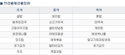 정상체중을 유지하고 체중감소를 방지하기 위한 적절한 식사량을 유지함으로써 호흡근육의 소모를 막고 적절한 영양상태를 유지하는 것이 중요합니다.
