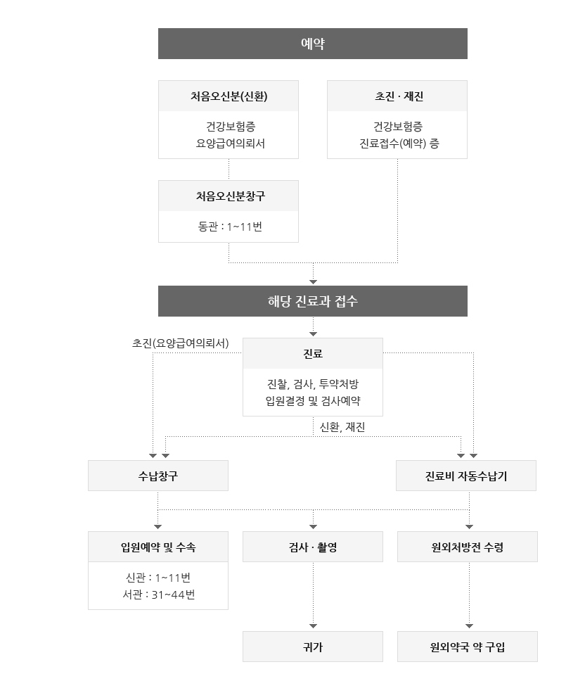 진료 후 요양급여의뢰서를 지참하신 초진 환자는 수납창구에서 수납을 진행해주세요.수납 후 검사,촬영을 하시고 귀사하시면 되며, 원외처방전을 수령하신 분은 원외약국에서 약을 구입하십시오. 입원예약 및 수속이 필요하신 분은 신관 1~11번 창구 또는 서관 31~ 42번 창구에서 진행하시기 바랍니다.
